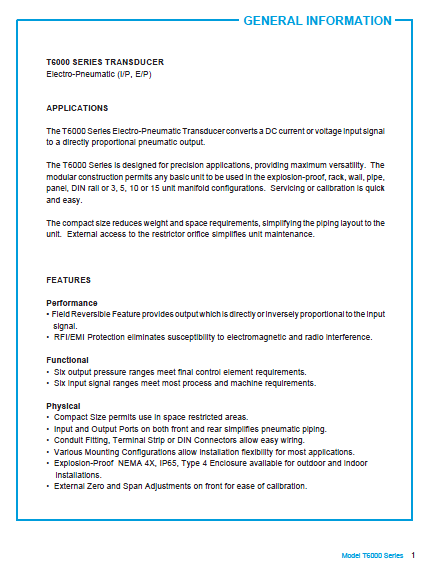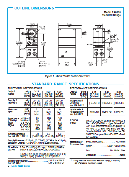 Fairchild TA6000-42, TA6000-402 4-20mA, 3-27 psig 1/2"FNPT Conduit Fairchild TA6000-43, TA6000-403 4-20mA, 6-30 psig 1/2"FNPT Conduit Fairchild TA6000-44, TA6000-404 4-20mA, 0-30 psig 1/2"FNPT Conduit Fairchild TA6000-45, TA6000-405 4-20mA, 0-60 psig 1/2"FNPT Conduit Fairchild TA6000-46, TA6000-406 4-20mA, 0-120 psig 1/2"FNPT Conduit Fairchild TA6000-51, TA6000-501 1-5 VDC, 3-15 psig 1/2"FNPT Conduit Fairchild TA6000-52, TA6000-502 1-5 VDC, 3-27 psig 1/2"FNPT Conduit Fairchild TA6000-53, TA6000-503 1-5 VDC, 6-30 psig 1/2"FNPT Conduit Fairchild TA6000-54, TA6000-504 1-5 VDC, 0-30 psig 1/2"FNPT Conduit Fairchild TA6000-55, TA6000-505 1-5 VDC, 0-60 psig 1/2"FNPT Conduit Fairchild TA6000-56, TA6000-506 1-5 VDC, 0-120 psig 1/2"FNPT Conduit Fairchild TA6000-91, TA6000-901 1-9VDC, 3-15 psig 1/2"FNPT Conduit Fairchild TA6000-92, TA6000-902 1-9VDC, 3-27 psig 1/2"FNPT Conduit Fairchild TA6000-93, TA6000-903 1-9VDC, 6-30 psig 1/2"FNPT Conduit Fairchild TA6000-94, TA6000-904 1-9VDC, 0-30 psig 1/2"FNPT Conduit Fairchild TA6000-95, TA6000-905 1-9VDC, 0-60 psig 1/2"FNPT Conduit Fairchild TA6000-96, TA6000-906 1-9VDC, 0-120 psig 1/2"FNPT Conduit Fairchild TD6000-41, TD6000-401 4-20mA, 3-15 psig DIN Connector Fairchild TD6000-42, TD6000-402 4-20mA, 3-27 psig DIN Connector Fairchild TD6000-43, TD6000-403 4-20mA, 6-30 psig DIN Connector Fairchild TD6000-44, TD6000-404 4-20mA, 0-30 psig DIN Connector Fairchild TD6000-45, TD6000-405 4-20mA, 0-60 psig DIN Connector Fairchild TD6000-46, TD6000-406 4-20mA, 0-120 psig DIN Connector Fairchild TD6000-51, TD6000-501 1-5 VDC, 3-15 psig DIN Connector Fairchild TD6000-52, TD6000-502 1-5 VDC, 3-27 psig DIN Connector Fairchild TD6000-53, TD6000-503 1-5 VDC, 6-30 psig DIN Connector Fairchild TD6000-54, TD6000-504 1-5 VDC, 0-30 psig DIN Connector Fairchild TD6000-55, TD6000-505 1-5 VDC, 0-60 psig DIN Connector Fairchild TD6000-56, TD6000-506 1-5 VDC, 0-120 psig DIN Connector Fairchild TD6000-91, TD6000-901 1-9VDC, 3-15 psig DIN Connector Fairchild TD6000-92, TD6000-902 1-9VDC, 3-27 psig DIN Connector Fairchild TD6000-93, TD6000-903 1-9VDC, 6-30 psig DIN Connector Fairchild TD6000-94, TD6000-904 1-9VDC, 0-30 psig DIN Connector Fairchild TD6000-95, TD6000-905 1-9VDC, 0-60 psig DIN Connector Fairchild TD6000-96, TD6000-906 1-9VDC, 0-120 psig DIN Connector Fairchild TT6000-41, TT6000-401 4-20mA, 3-15 psig Terminal Strip Fairchild TT6000-42, TT6000-402 4-20mA, 3-27 psig Terminal Strip Fairchild TT6000-43, TT6000-403 4-20mA, 6-30 psig Terminal Strip Fairchild TT6000-44, TT6000-404 4-20mA, 0-30 psig Terminal Strip Fairchild TT6000-45, TT6000-405 4-20mA, 0-60 psig Terminal Strip Fairchild TT6000-46, TT6000-406 4-20mA, 0-120 psig Terminal Strip Fairchild TT6000-51, TT6000-501 1-5 VDC, 3-15 psig Terminal Strip Fairchild TT6000-52, TT6000-502 1-5 VDC, 3-27 psig Terminal Strip Fairchild TT6000-53, TT6000-503 1-5 VDC, 6-30 psig Terminal Strip Fairchild TT6000-54, TT6000-504 1-5 VDC, 0-30 psig Terminal Strip Fairchild TT6000-55, TT6000-505 1-5 VDC, 0-60 psig Terminal Strip Fairchild TT6000-56, TT6000-506 1-5 VDC, 0-120 psig Terminal Strip Fairchild TT6000-91, TT6000-901 1-9VDC, 3-15 psig Terminal Strip Fairchild TT6000-92, TT6000-902 1-9VDC, 3-27 psig Terminal Strip Fairchild TT6000-93, TT6000-903 1-9VDC, 6-30 psig Terminal Strip Fairchild TT6000-94, TT6000-904 1-9VDC, 0-30 psig Terminal Strip Fairchild TT6000-95, TT6000-905 1-9VDC, 0-60 psig Terminal Strip Fairchild TT6000-96, TT6000-906 1-9VDC, 0-120 psig Terminal Strip Fairchild T5700-4, T5700-40 4-20mA & 10-50mA, 3-15 psig Fairchild T5700-9, T5700-90 1-5 VDC & 1-9VDC, 3-15 psig Fairchild T5200-4, T5200-40 4-20mA & 10-50mA, 3-15 psig Fairchild T5200-5, T5200-50 1-5 VDC, 3-15 psig Fairchild T5200-9, T5200-90 1-9VDC, 3-15 psig Fairchild T5220-4, T5220-40 4-20mA & 10-50mA, 3-15 psig Fairchild T5220-5, T5220-50 1-5 VDC, 3-15 psig Fairchild T5220-9, T5220-90 1-9VDC, 3-15 psig
